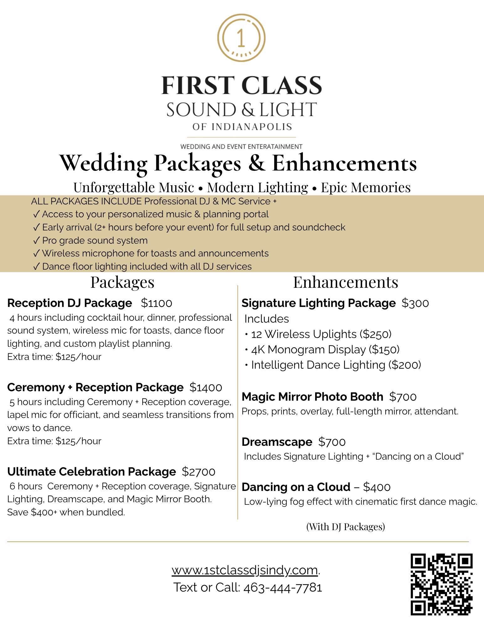 First Class Sound & Light of Indianapolis is your premier Indianapolis wedding DJ and event entertainment company. We specialize in modern, high-energy receptions, seamless ceremony sound, and luxury enhancements like intelligent lighting, “Dancing on a Cloud,” and our interactive Magic Mirror photo booth. Our professional DJs and MCs create unforgettable experiences with expert mixing, smooth transitions, and music that keeps the dance floor packed all night. Serving Indianapolis, Carmel, Fishers, Noblesville, Greenwood, and the greater Indiana area, we’re here to make your wedding or special event unique, stress-free, and truly first class.